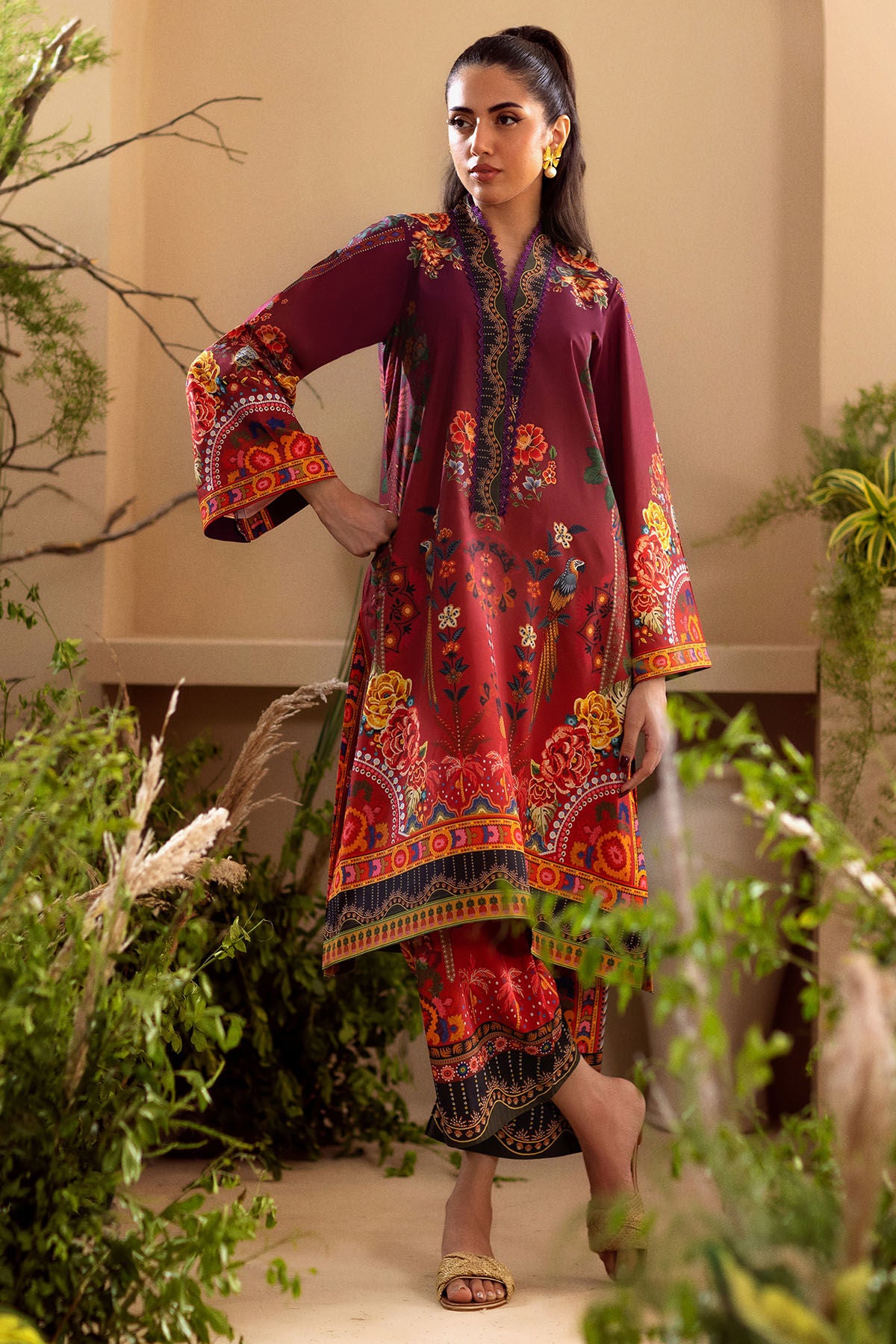 Co-ordinating set crafted from crepe silk, adorned with whimsical floral printed details. This ensemble includes a knee-length shirt characterized by a loose silhouette, embellished with floral and fauna printed accents. The shirt is elegantly paired with loose-fitting coordinating trousers.