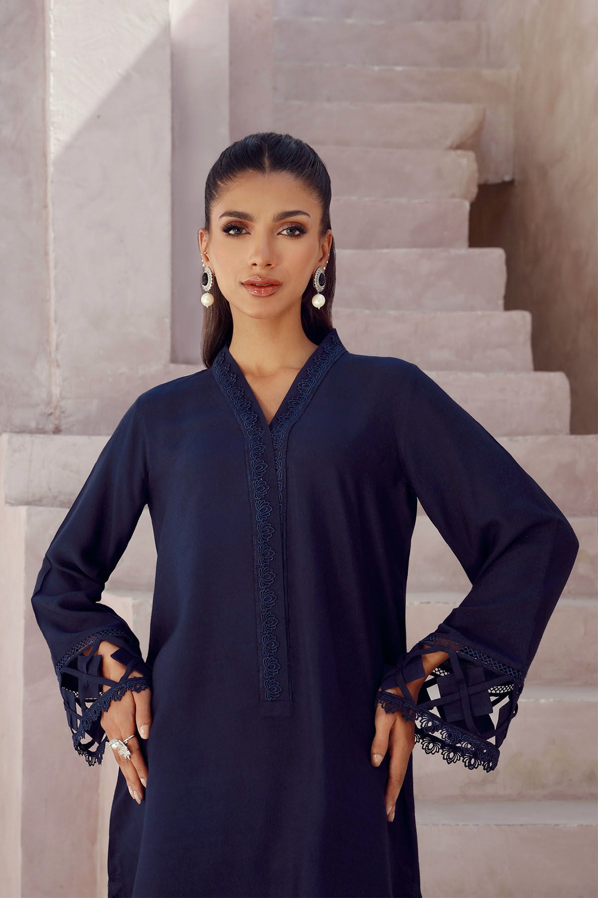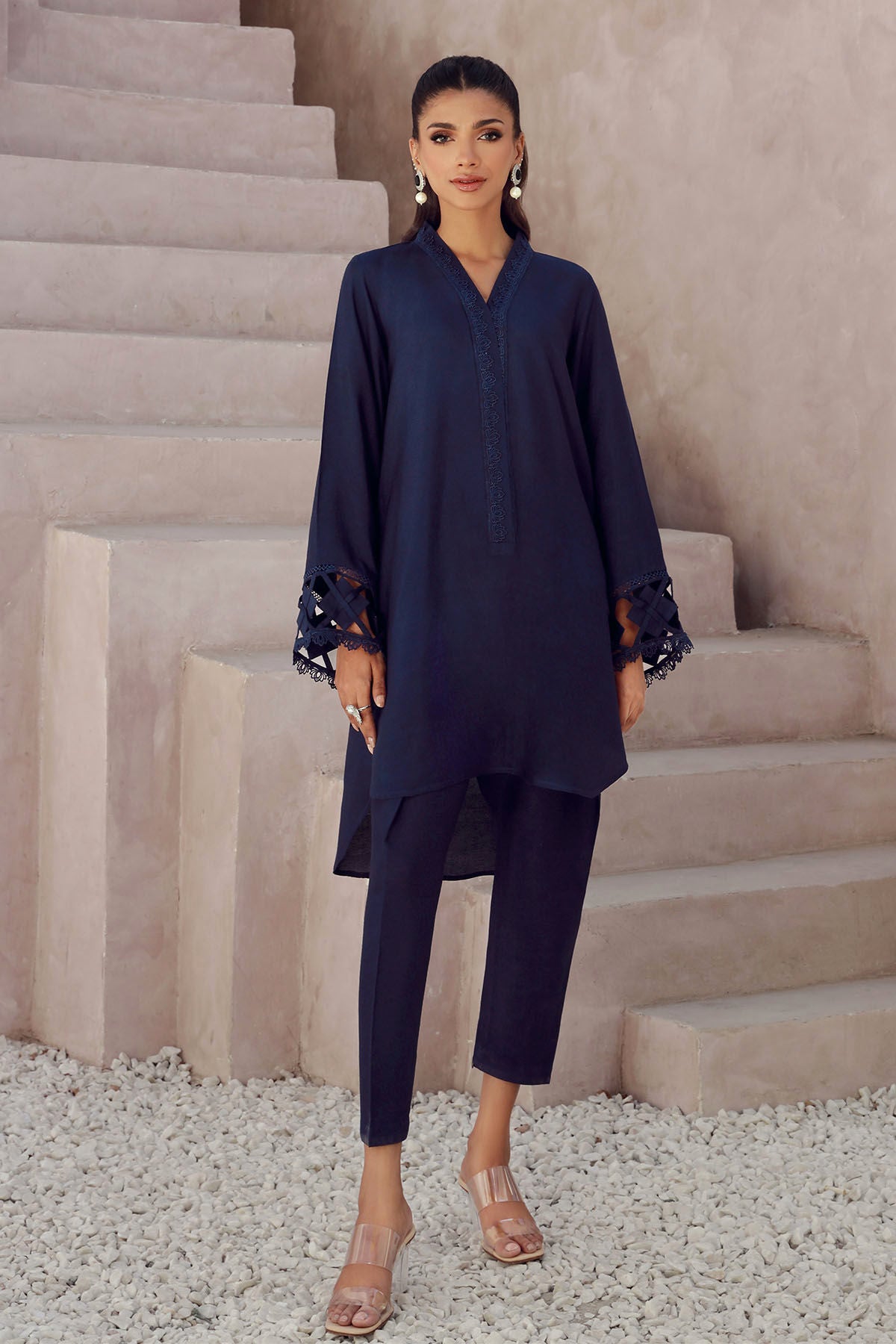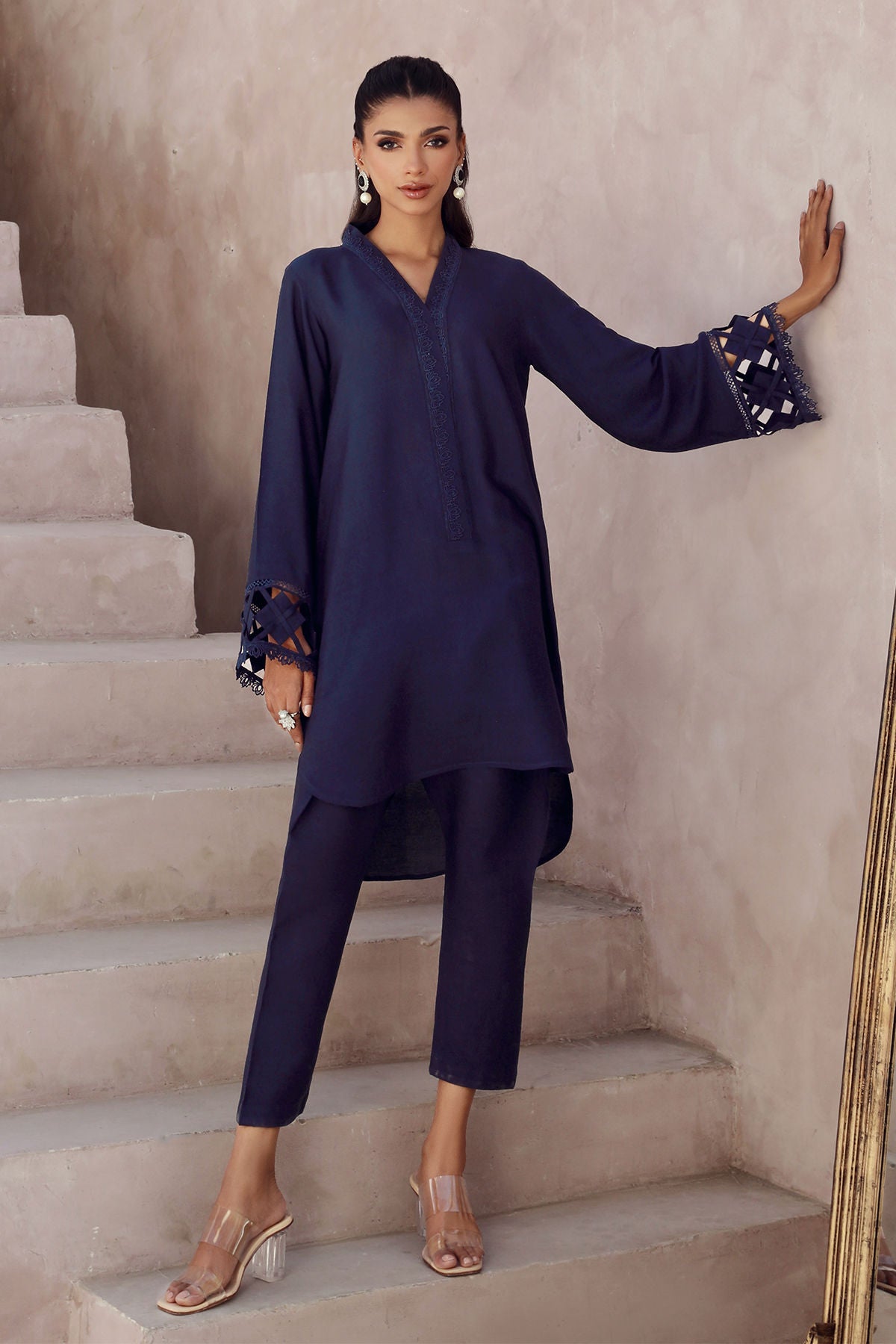 High low silhouette co-ord set in deep blue featuring fabric manipulation details on sleeves. The neckline is adorned with lace details and the side seam is featuring pocket details. The co-ord is paired with shalwar for a sleeker look.