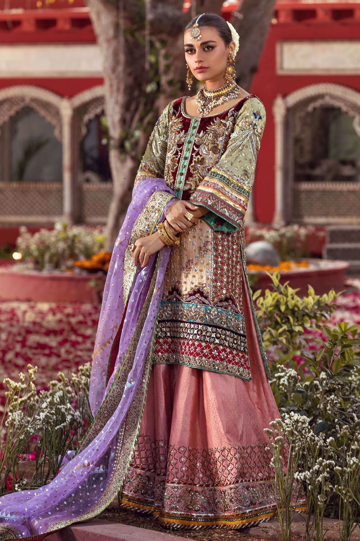 Ochre yellow A-line shirt with deep pink side panels of hand block printed techniques. The shirt has velvet appliqué on the neckline which is enhanced with old school hand embroidered details. The hemline of the shirt has multicolored appliqué with different hand embroidered techniques on each panel. Shimmery peach hand block printed dhaka pajama with gota details completes the look. Lilac hand block printed dupatta with dabka zari and gota details makes this outfit head turning.