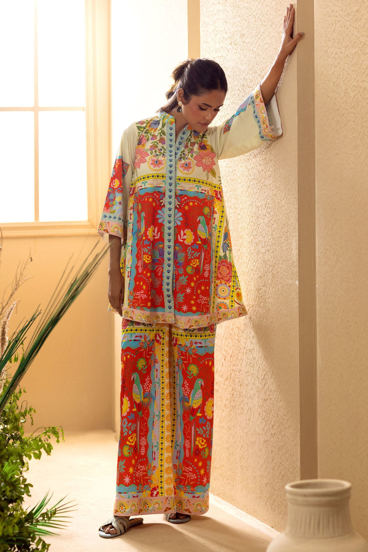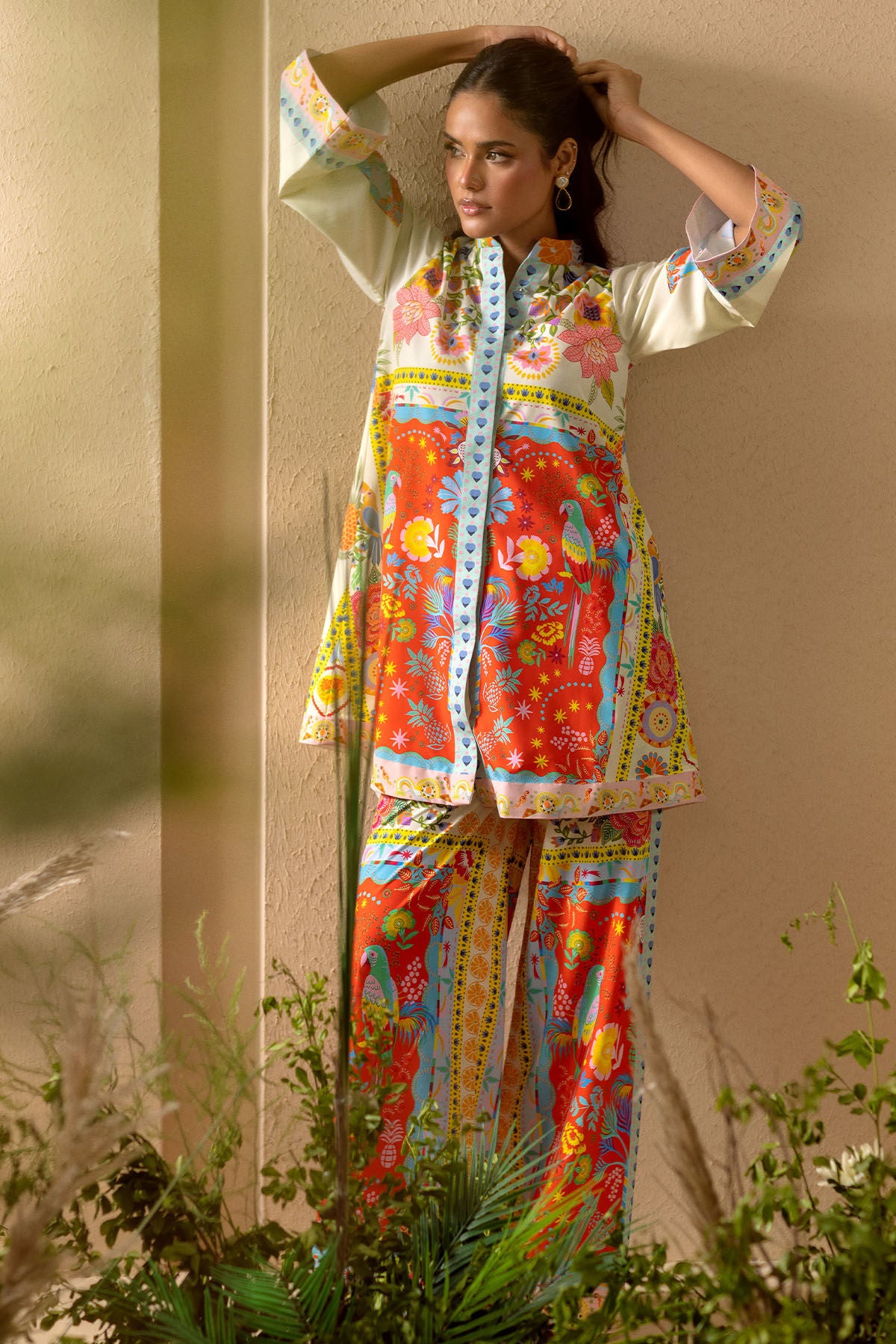 Co-ordinating set crafted from crepe silk, adorned with whimsical floral printed details. This ensemble includes a knee-length shirt characterized by a loose silhouette, embellished with floral and fauna printed accents. The shirt is elegantly paired with loose-fitting coordinating trousers.