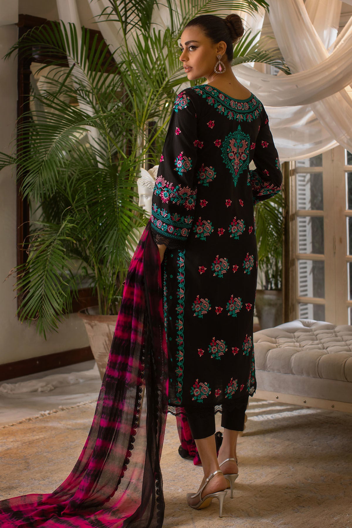 Long silhouette shirt on black faux silk canvas featuring multicolored floral embroidered details in shades of pinks and sea green. The shirt is adorned with crochet laces and a handcrafted embellished neckline featuring dabka and light-catching crystals. The shirt can be paired with straight raw silk pants. The shirt comes with tie and dye chiffon dupatta featuring crochet laces on each side.