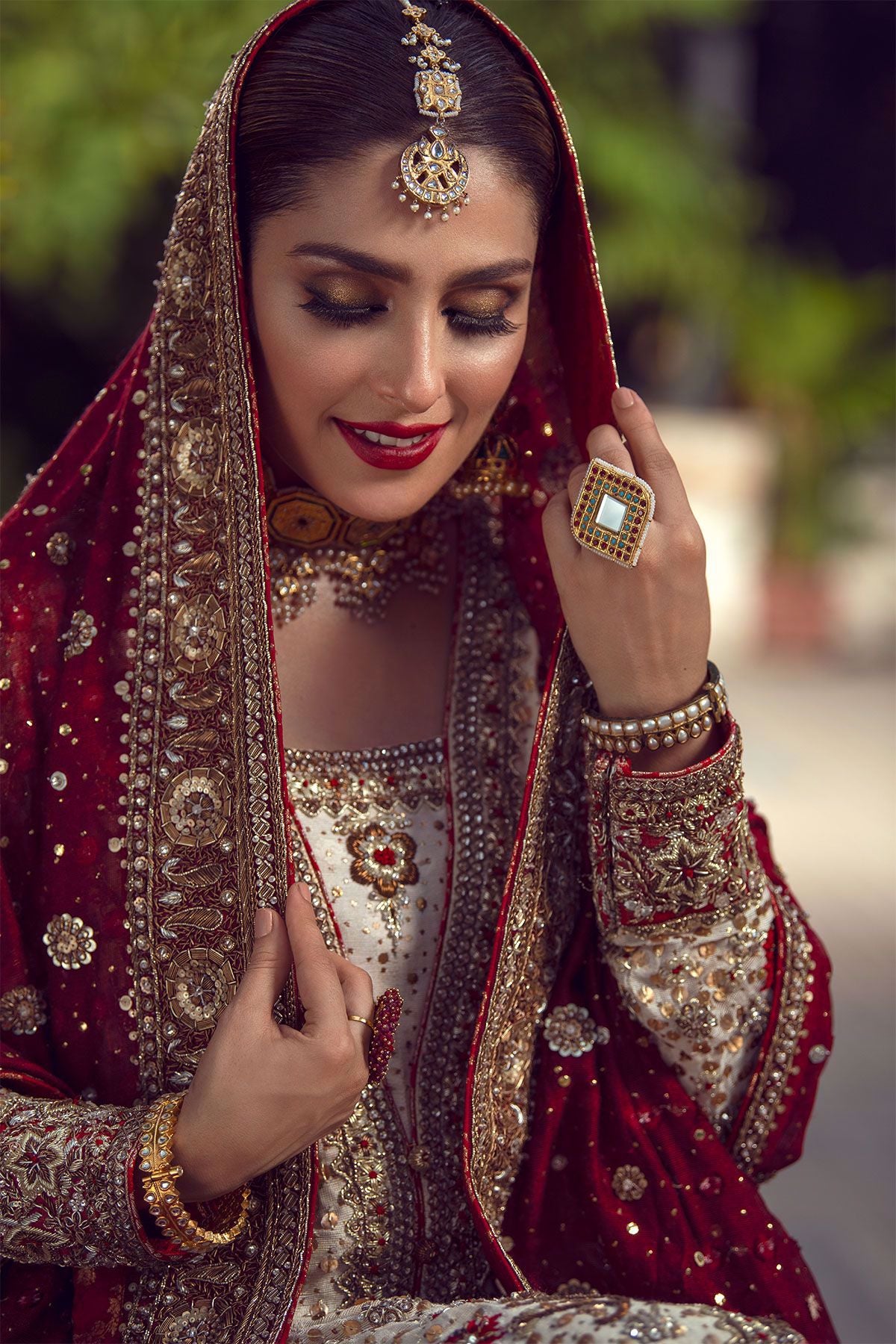 An ivory front open A-line shirt with romantic old school details of antique dabka incorporated with majestic silk thread embroidered details, the shirt is adorned with stunning kaamdani details and the hemline is exquisitely handcrafted with maroon appliqué details. The shirt is layered over a deep maroon velvet dhaka pajama. The ensemble is paired with scarlet chunri dupatta with kaamdani details and heavily embroidered borders.
