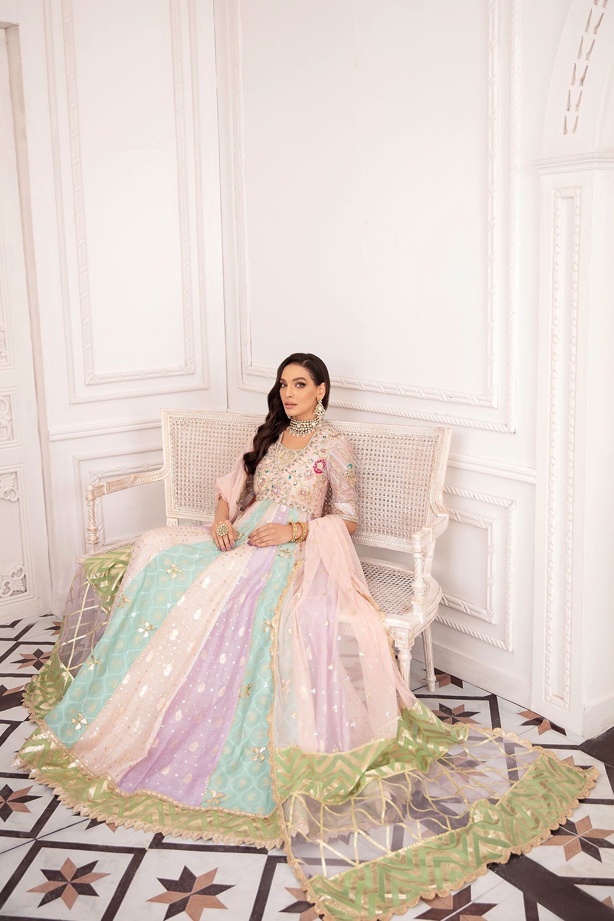 Floor length multicolored Kalidar featuring subtle pastels panels featuring sequins and gota details in each panels. The bodice is adorned with floral blooms and zardozi details. The colour blocked sleeves is handcrafted to perfection with zardozi details and further enhanced with peacock motif on each sleeve. The Kalidar is paired with straight pants and colour blocked net and sequins dupatta.