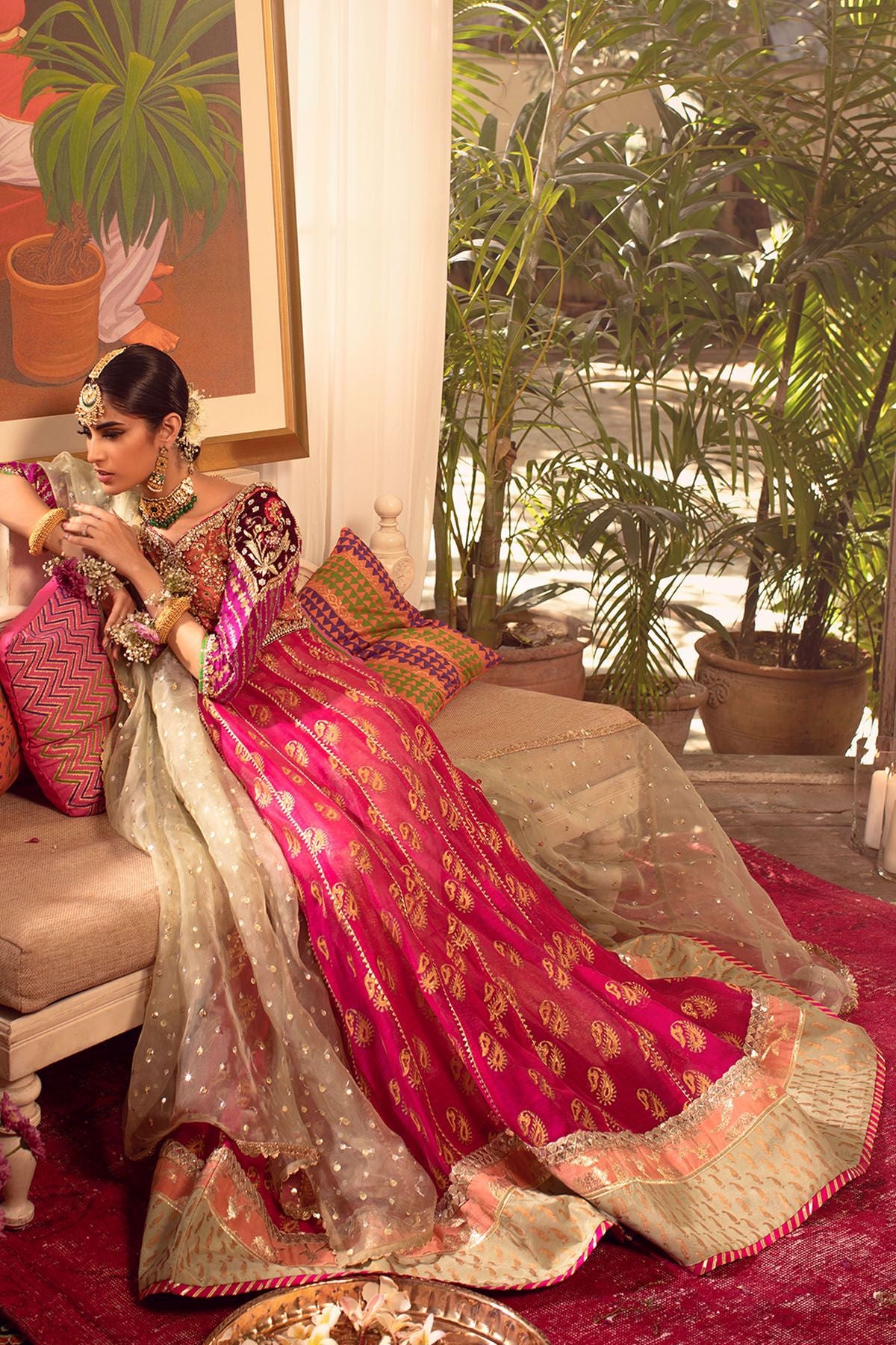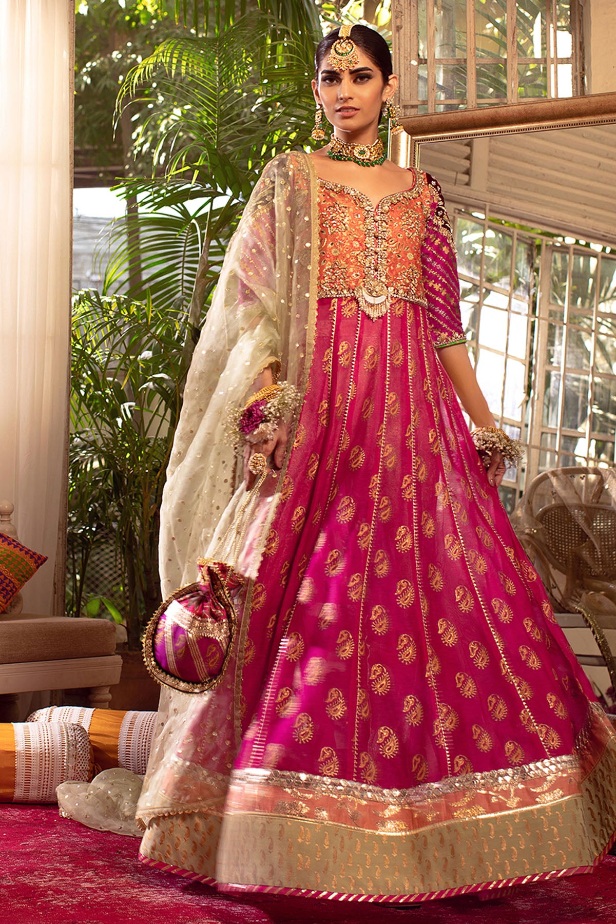 Flared silhouette hand block printed color blocked pishwas in burnt orange, magenta and fuchsia pink. The neckline of the pishwas is adorned with zardozi embroidery on velvet appliqué. The three quarter magenta sleeves are hand block printed and are further enhanced with dabka and silk thread embroidery details. The back of the shirt has handcrafted gota tassels. The pishwas is layered over gold straight pants and paired with dhani green dupatta with sequins and lace finishing’s.