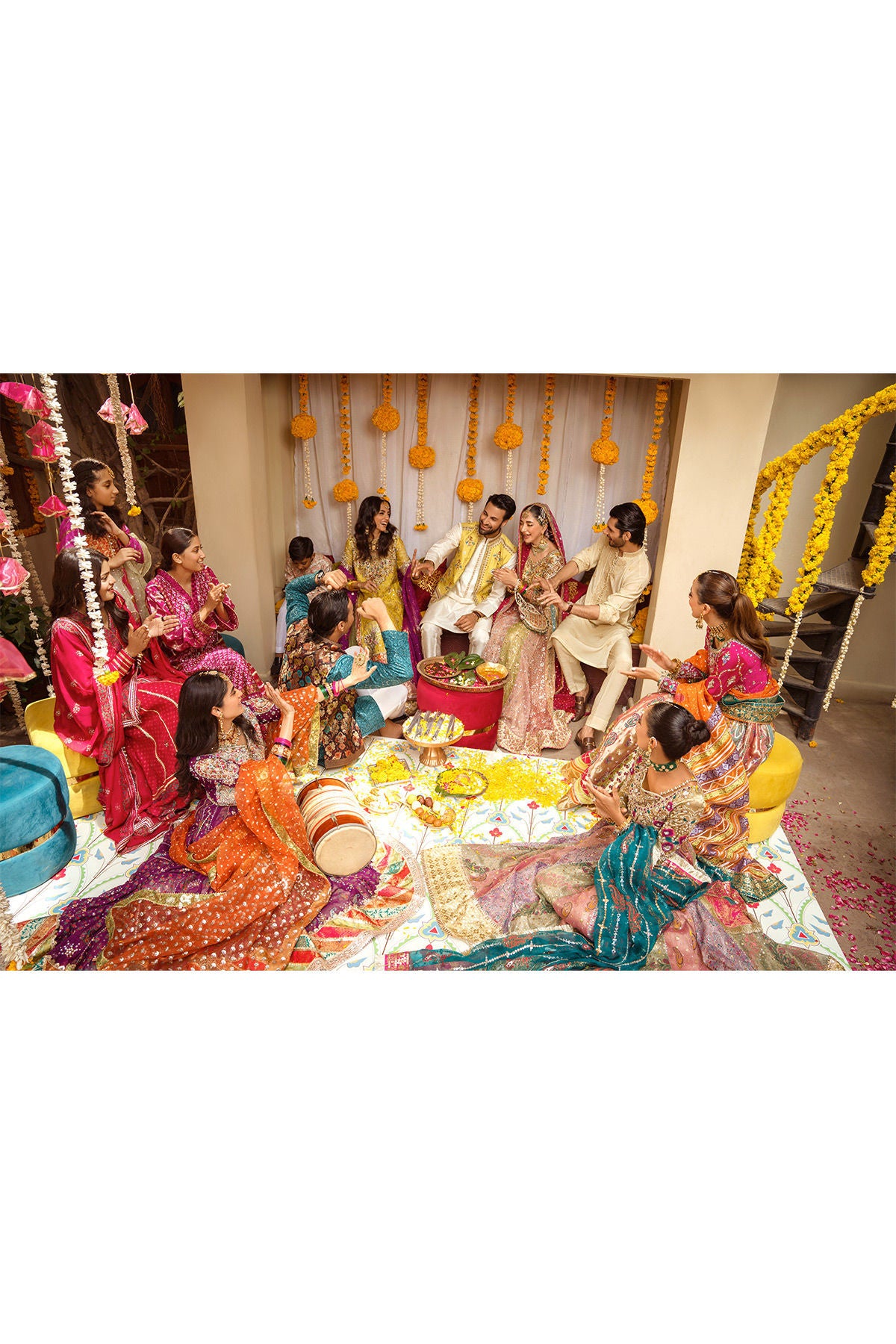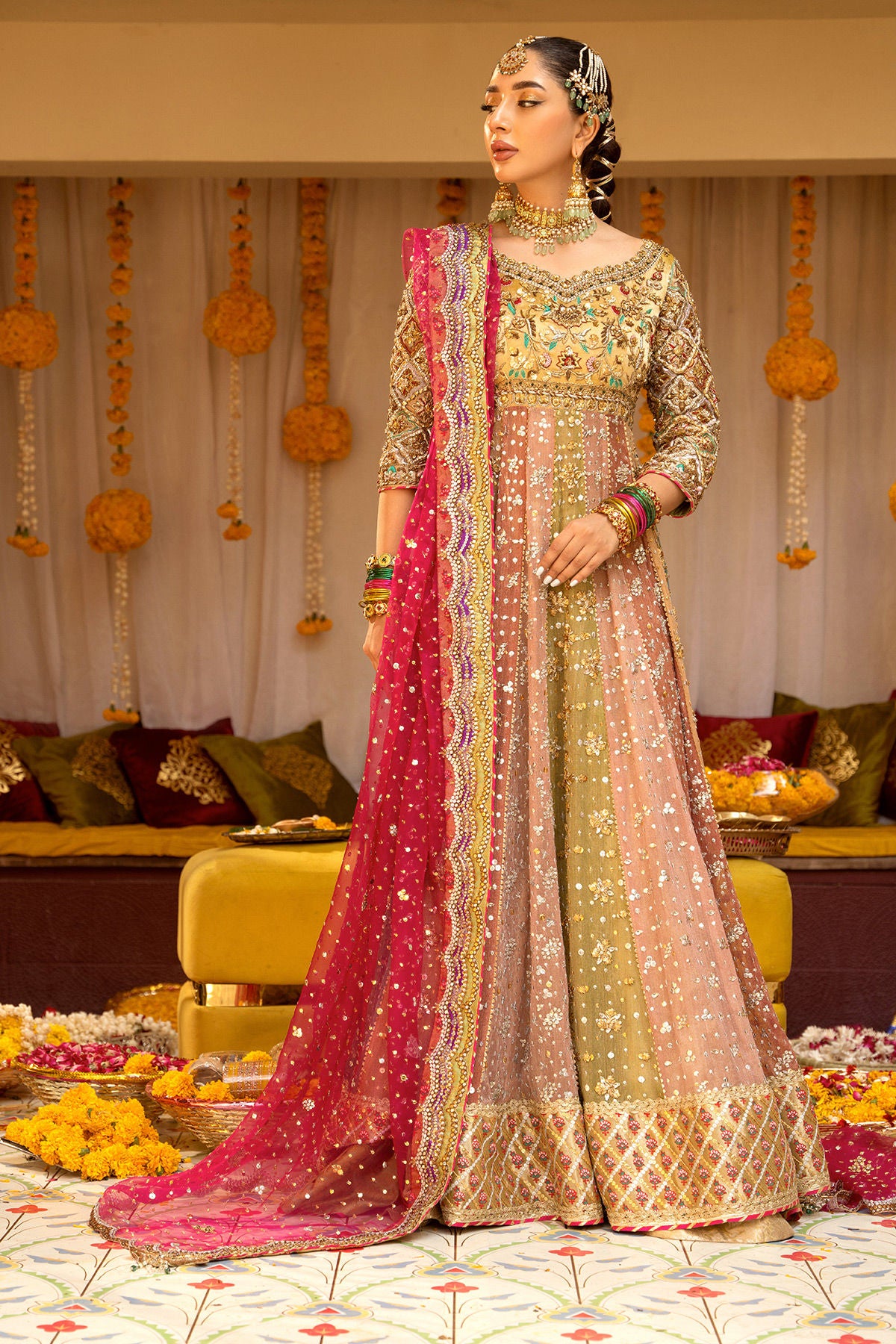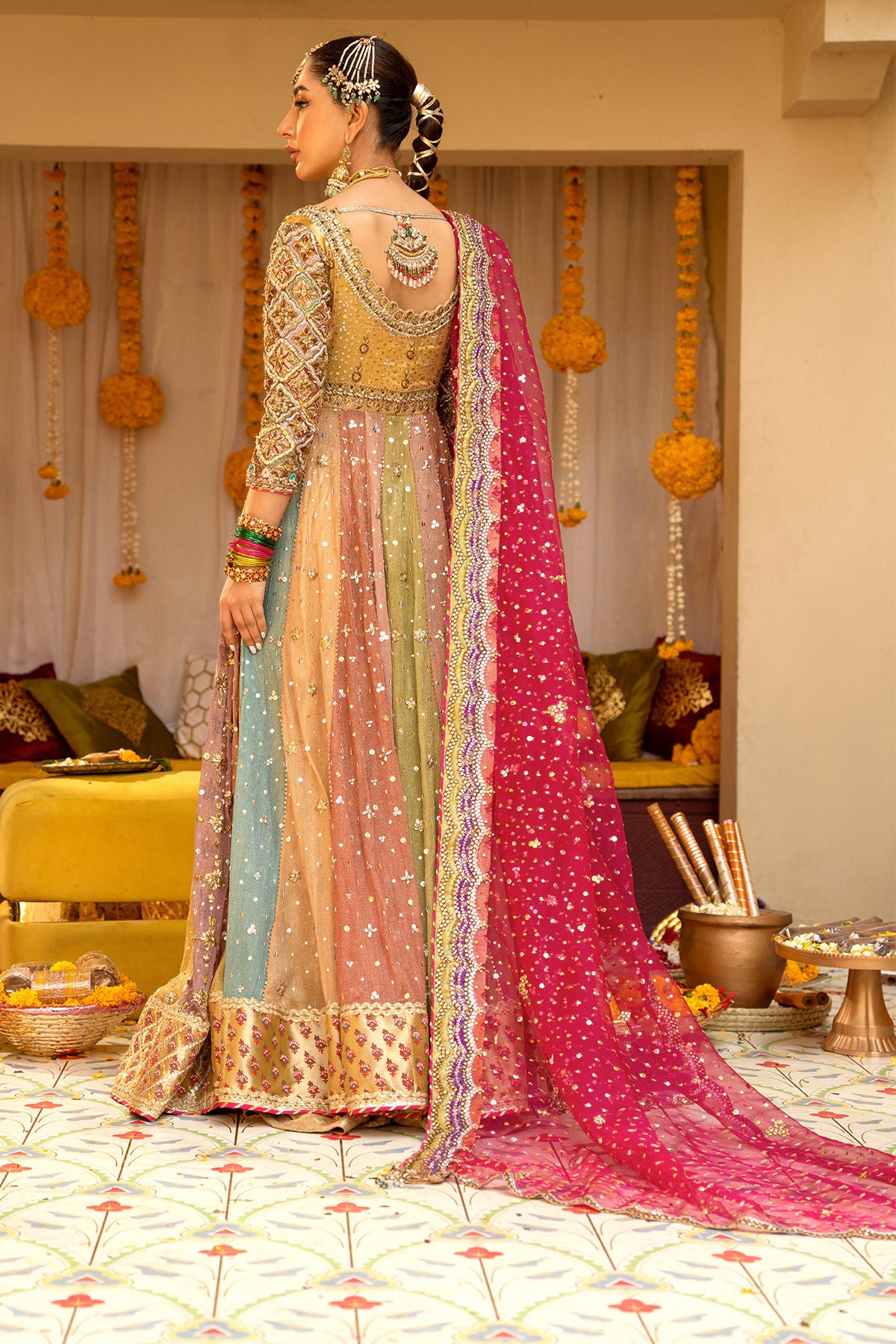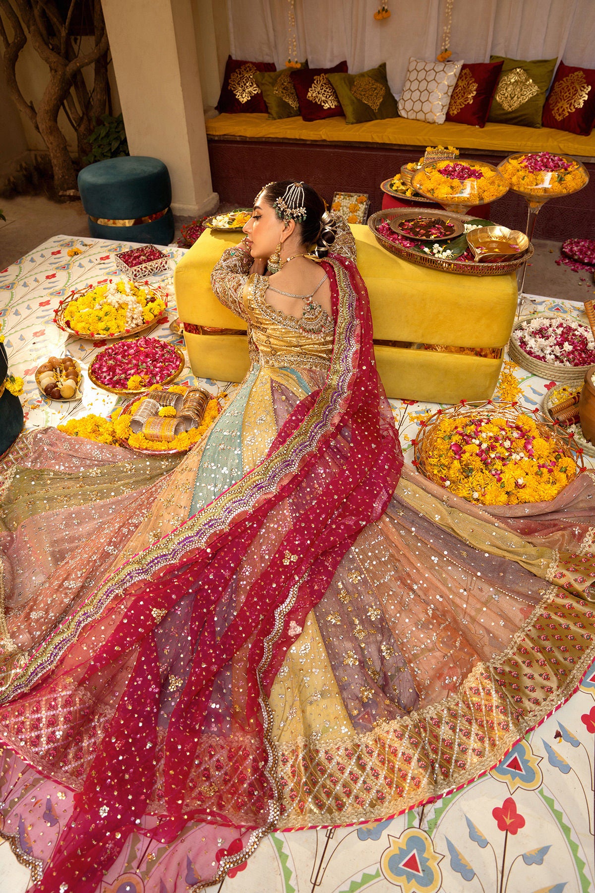 This multicolored zari net pishwas in muted shades enhanced with old school gota and sequin details on each panel. The lamé gold bodice is enhanced with age old antique zardozi, resham and gota details. The kalidar is paired with deep pink scalloped dupatta featuring multicolored appliqué details.
