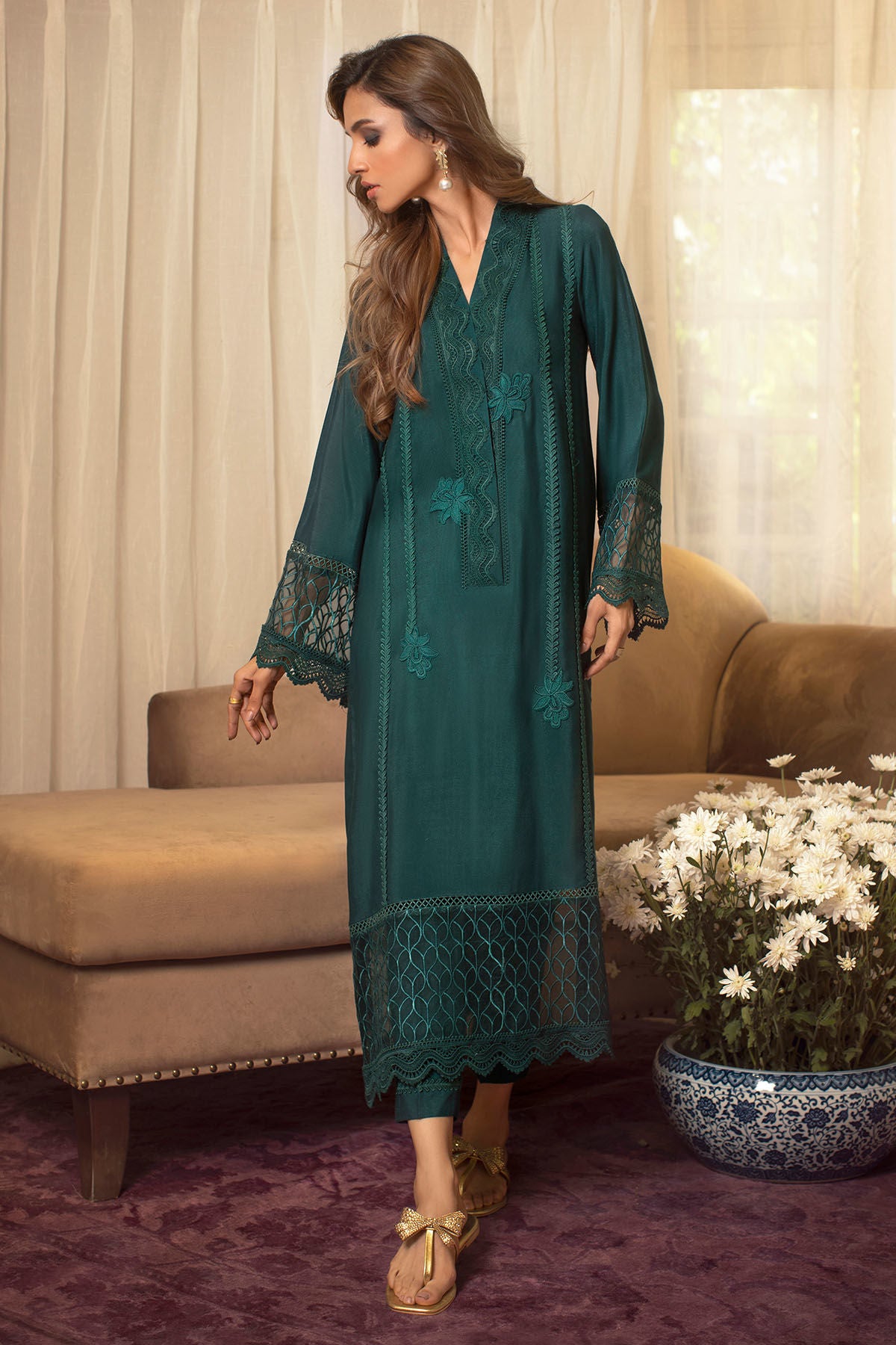 Long silhouette cotton net shirt in deep emerald shirt featuring crochet details on front, the hemline is adorned with self-embroidered organza details and laces.