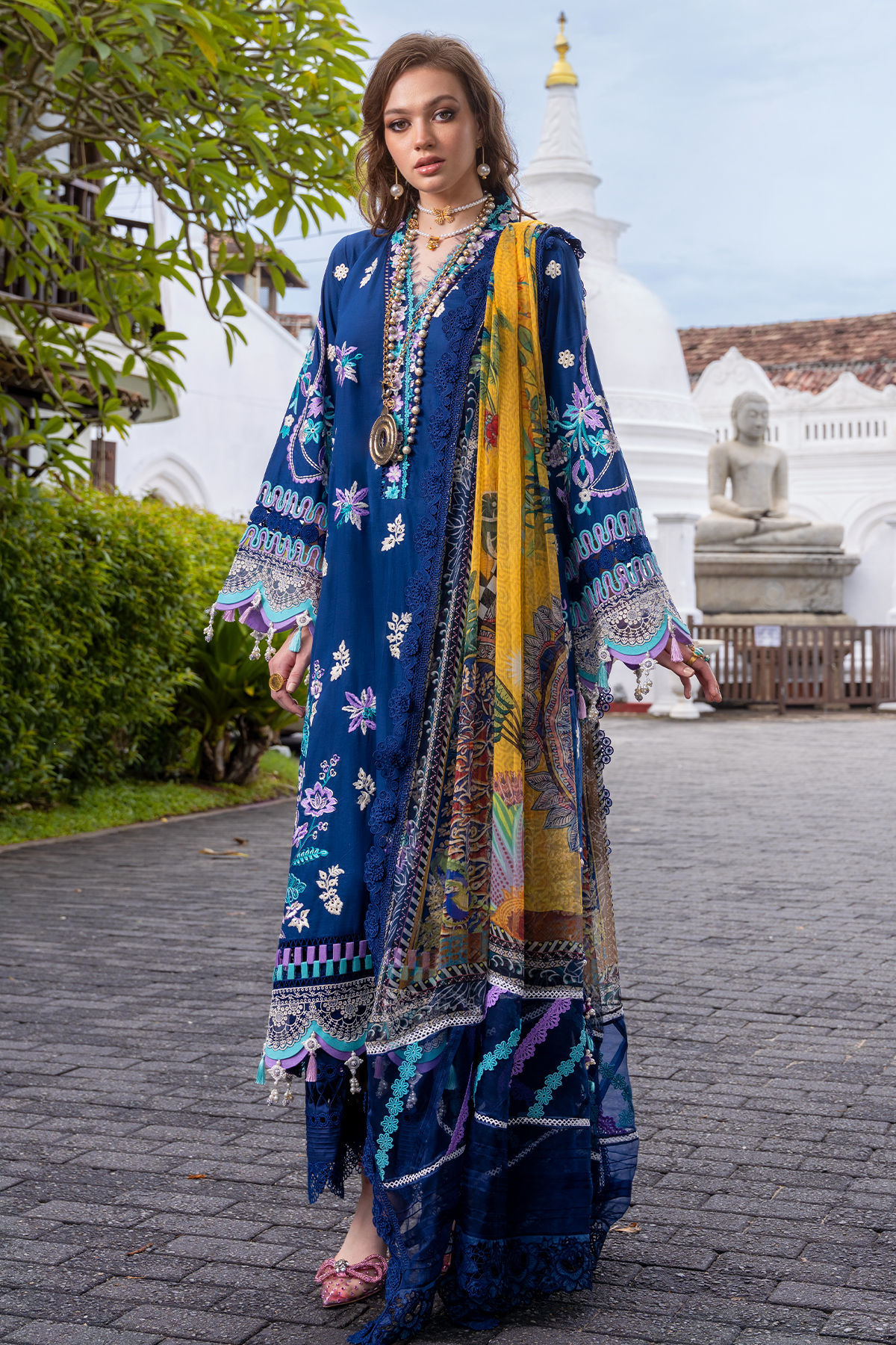 Rendered on a gorgeous turquiose canvas, "Riba" features single thread tone-on-tone miniature floral embroidered details. The side slits and hem are accentuated with cutwork panel details. The esemble is accompanied by breathable lawn bottoms and a gorgeously composed organza dupatta featuring whimsical floral details to set you a part this summer.