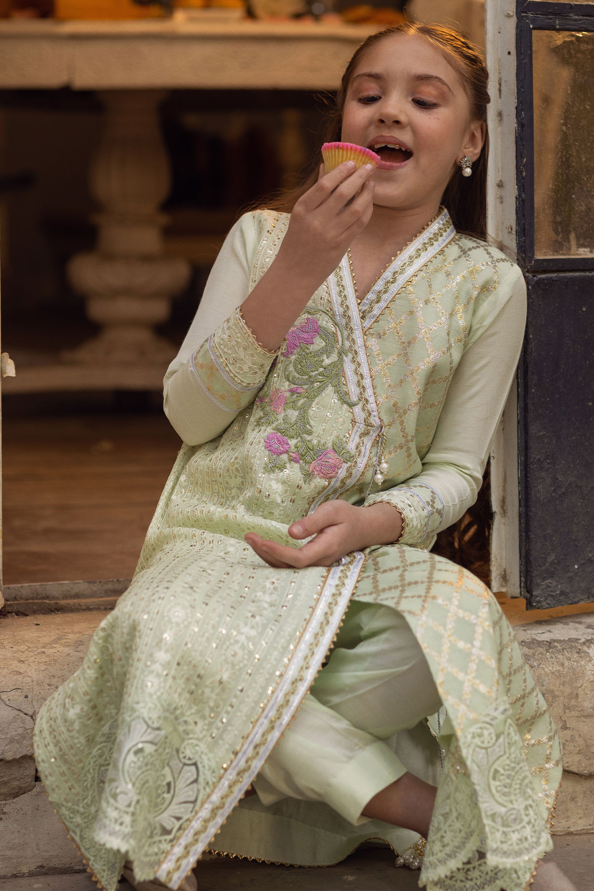 The mint green elongated silhouette angharka is rendered in delicate chiffon, adorned with exquisite chikankari embroidery. Intricate lace and gota accents grace the neckline, while the center front is highlighted with embroidered motif And meticulously handcrafted tassels. The sleeves feature refined zari appliqué motifs, and the ensemble is completed with a complimentary chiffon dupatta showcasing hand block–printed details, paired with matching straight pants.