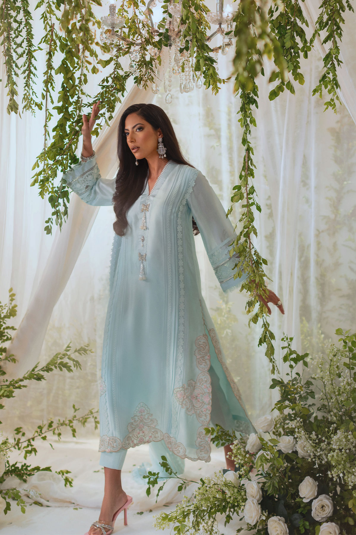 Long silhouette shirt in coolest shade of ice blue featuring pleats and lace details on centre front. The neckline is enhanced with fabric manipulation details which is further decorated handcrafted zardozi embellishments. The side slits are appliquéd to perfection with subtle silk thread embroidered motifs. The outfit is paired with signature AA dupatta and a matching straight raw silk pants.