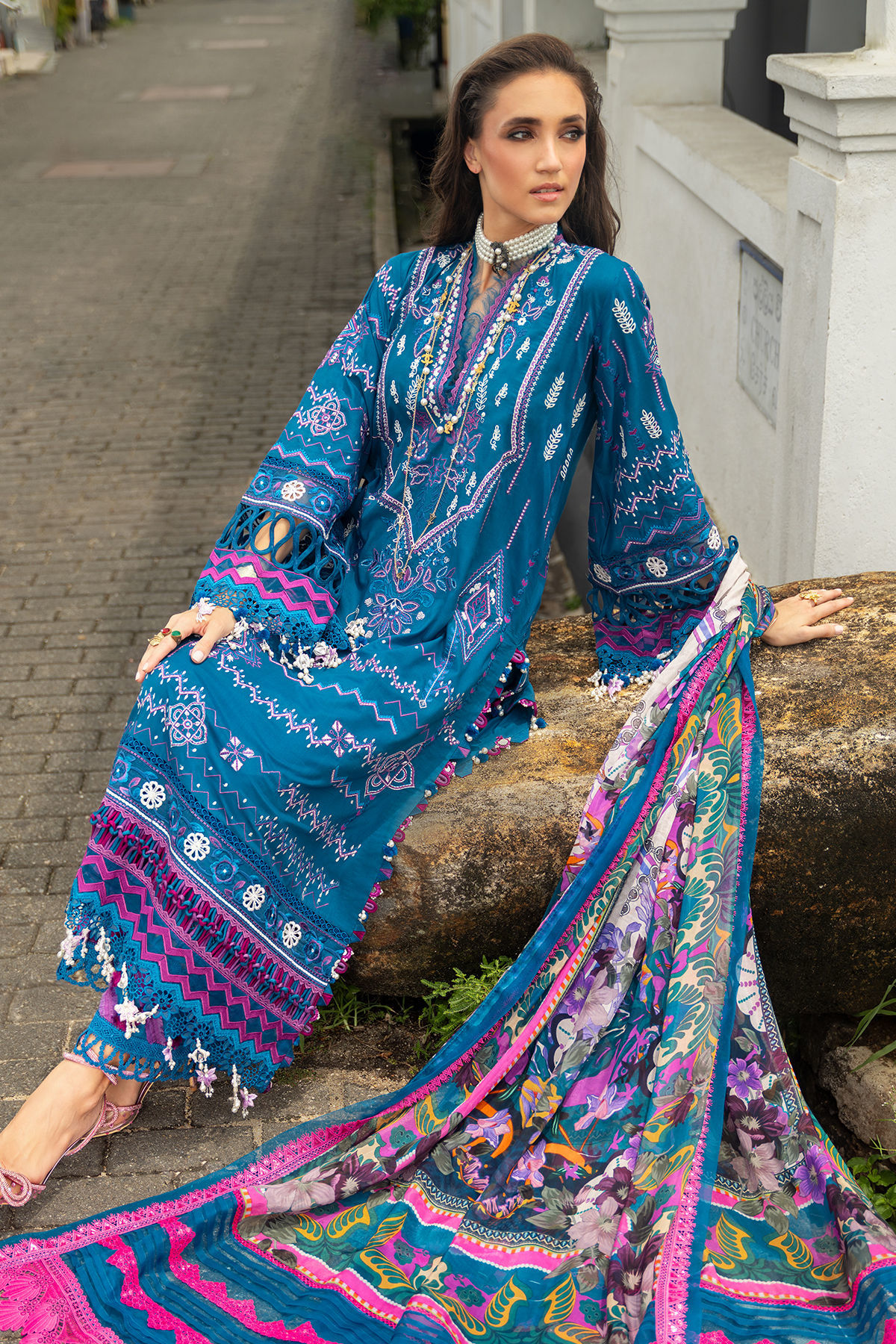 Seraya' unfolds on a refined digital print enriched with intricate embroidery cascading across the centre panel. Subtle organza overlays with laser detailing accentuate the hem and sleeves, lending contemporary depth. The neckline is delicately finished to harmonise with its composed floral layout. Styled with breathable lawn bottoms and a fluid chiffon dupatta, it offers poised sophistication for sunlit gatherings.