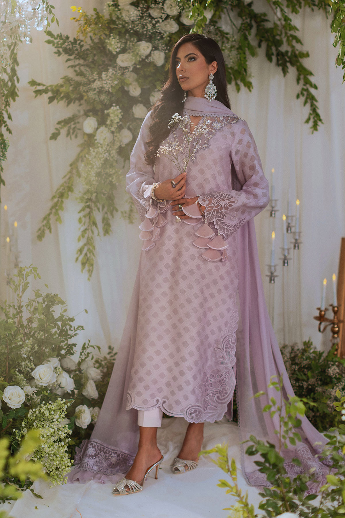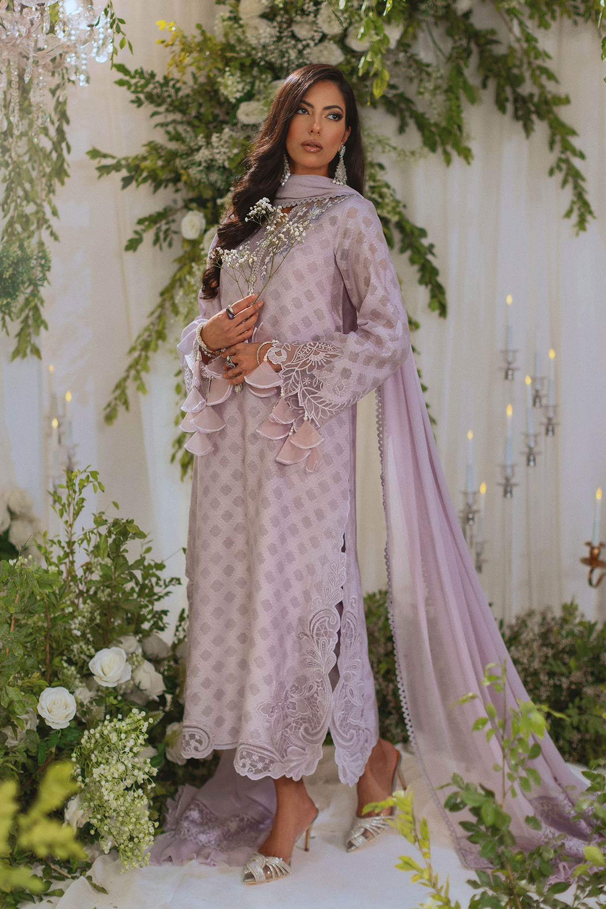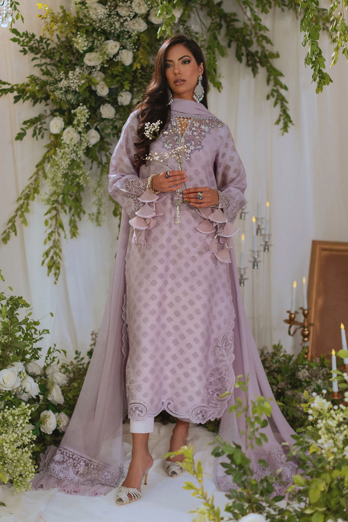 Long silhouette shirt on embossed silk net canvas featuring subtle embroidered details on neckline. The side slits are adorned with delicate paisley appliqué details and the sleeves are decorated with dangling tassels. The neckline is enhanced with handcrafted embellishment. The outfit comes with matching straight pants and chiffon dupatta features embossed organza panels on each pallu.