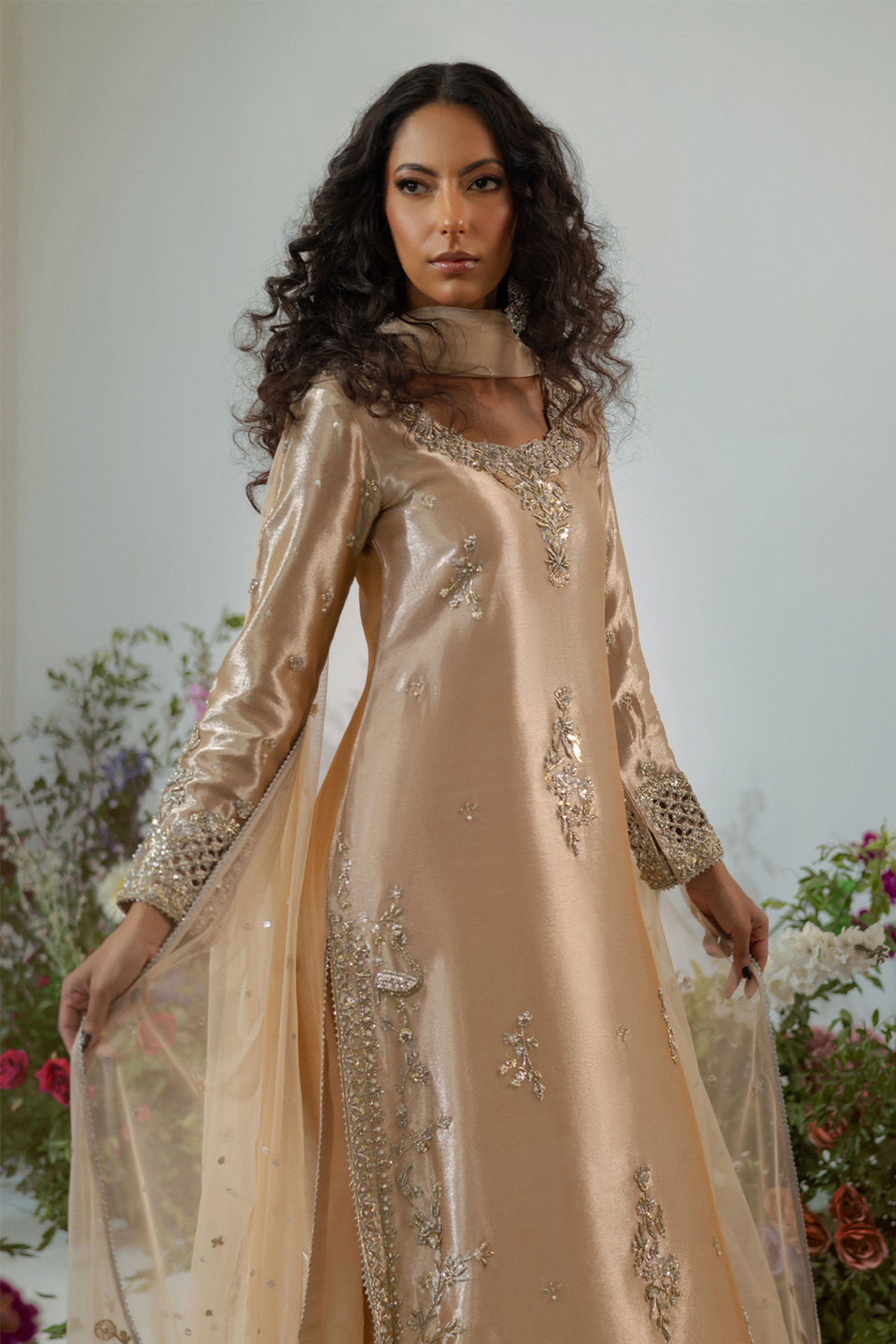 Elegant A-line shirt made of shimmering lamé fabric adorned with intricate silver and muted gold zardozi embellishments, accented with delicate pearls. The sleeves are beautifully crafted with cutwork detailing, perfect to be paired with damask dhaka and a net dupatta embellished with silver and gold sequins spray and zari appliqué embroidery on each pallu, making it a showstopper this festive season.