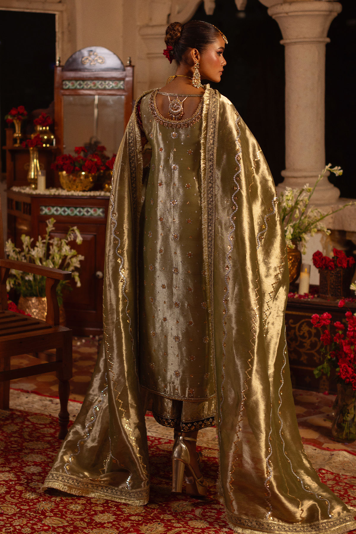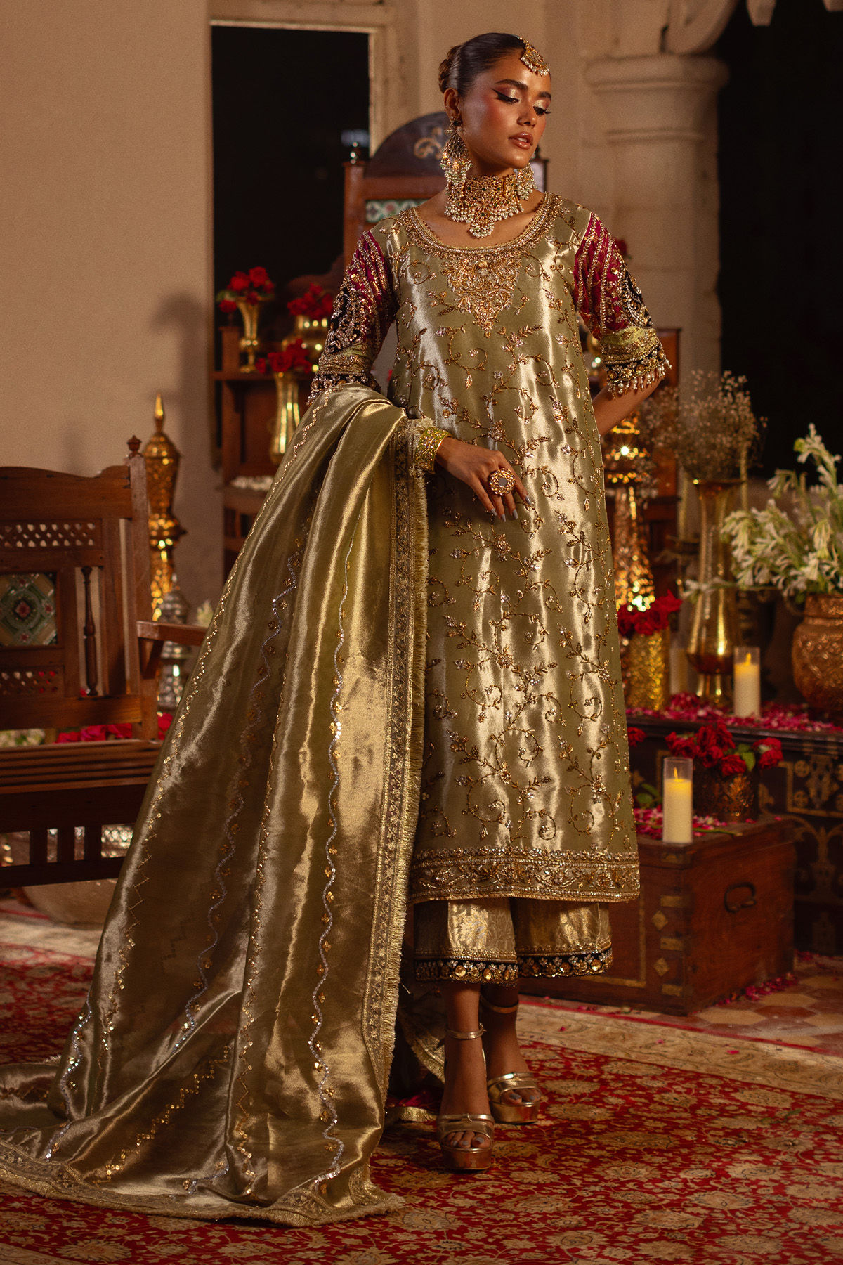 The long silhouette shirt is crafted from a glistening lamé canvas in an olive green hue, featuring an intricate antique and gold zardozi jaal on the center front. The neckline is elegantly enhanced with meticulously handcrafted miniature zardozi details. The color-blocked velvet and jamawar sleeves add a touch of glamour, adorned with classic zardozi elements. This ensemble is paired with a matching izaar, embellished with velvet appliqué and a zardozi border along the hem. Additionally, the outfit is complemented by a matching lamé dupatta, which showcases exquisite sequin details and is bordered with zari, featuring fringe accents on each side.