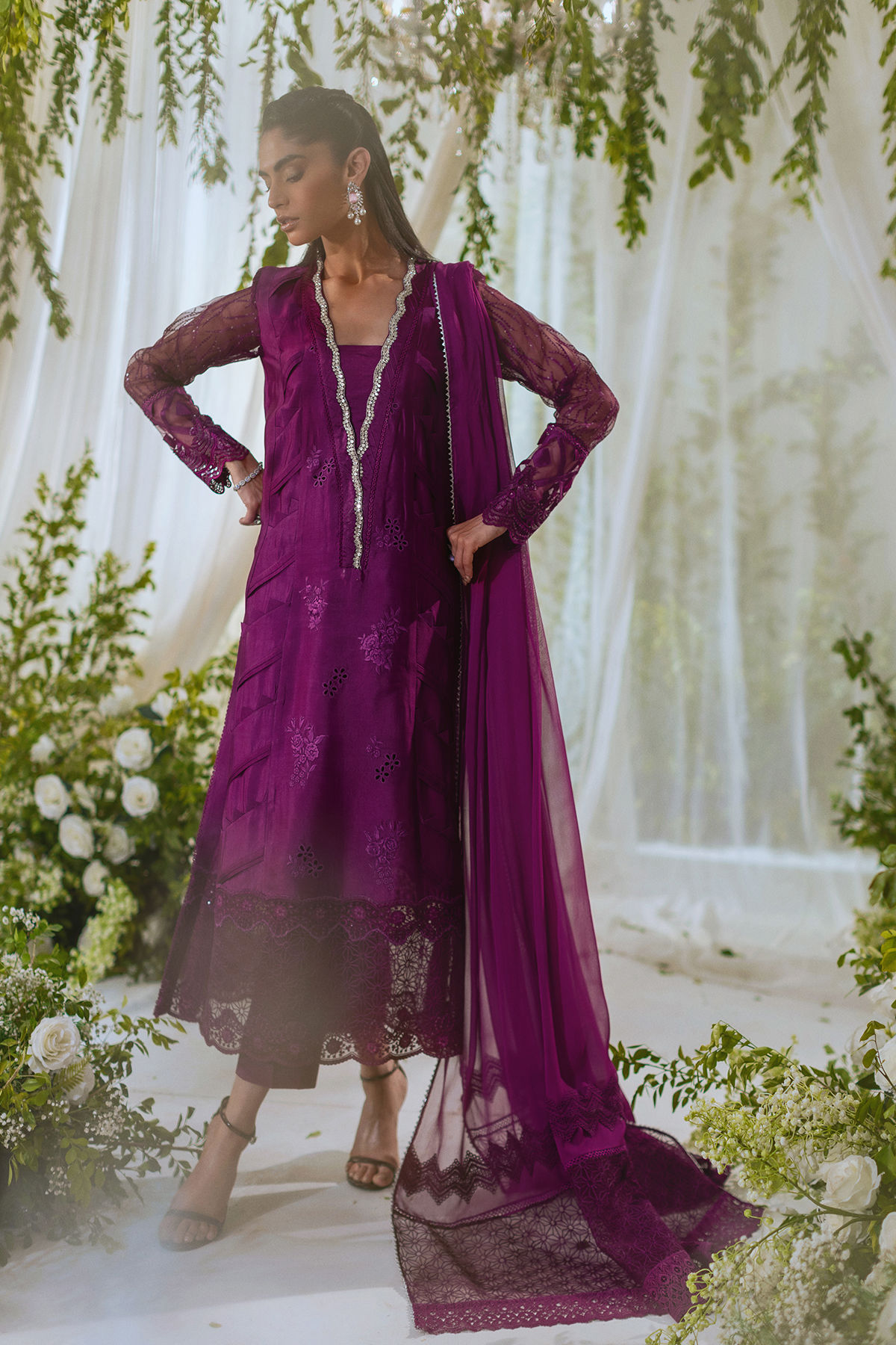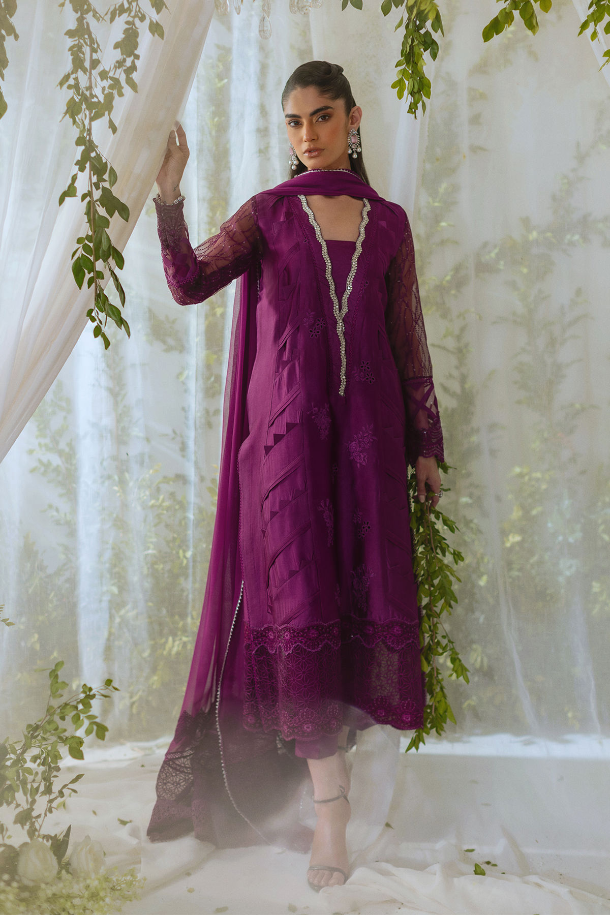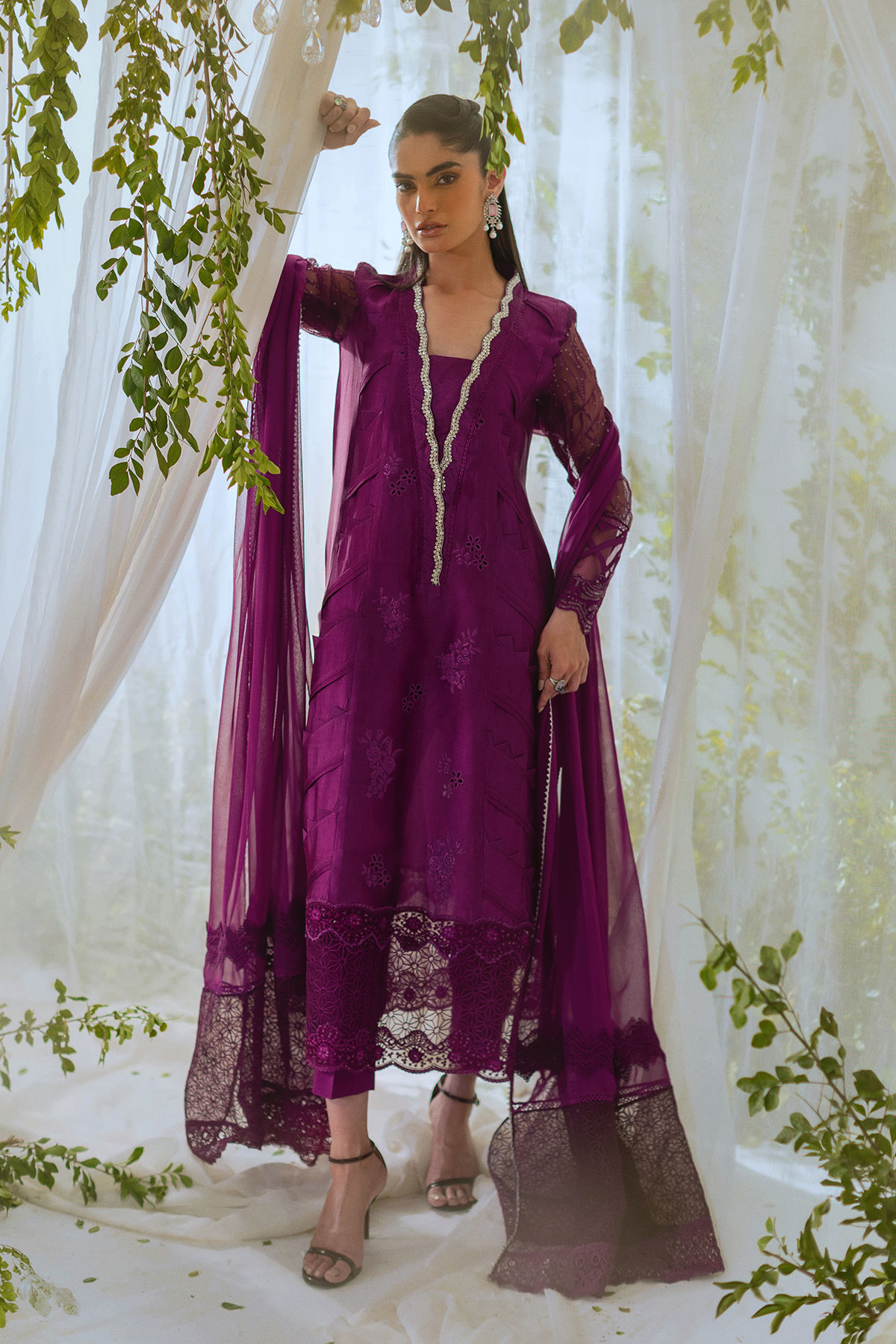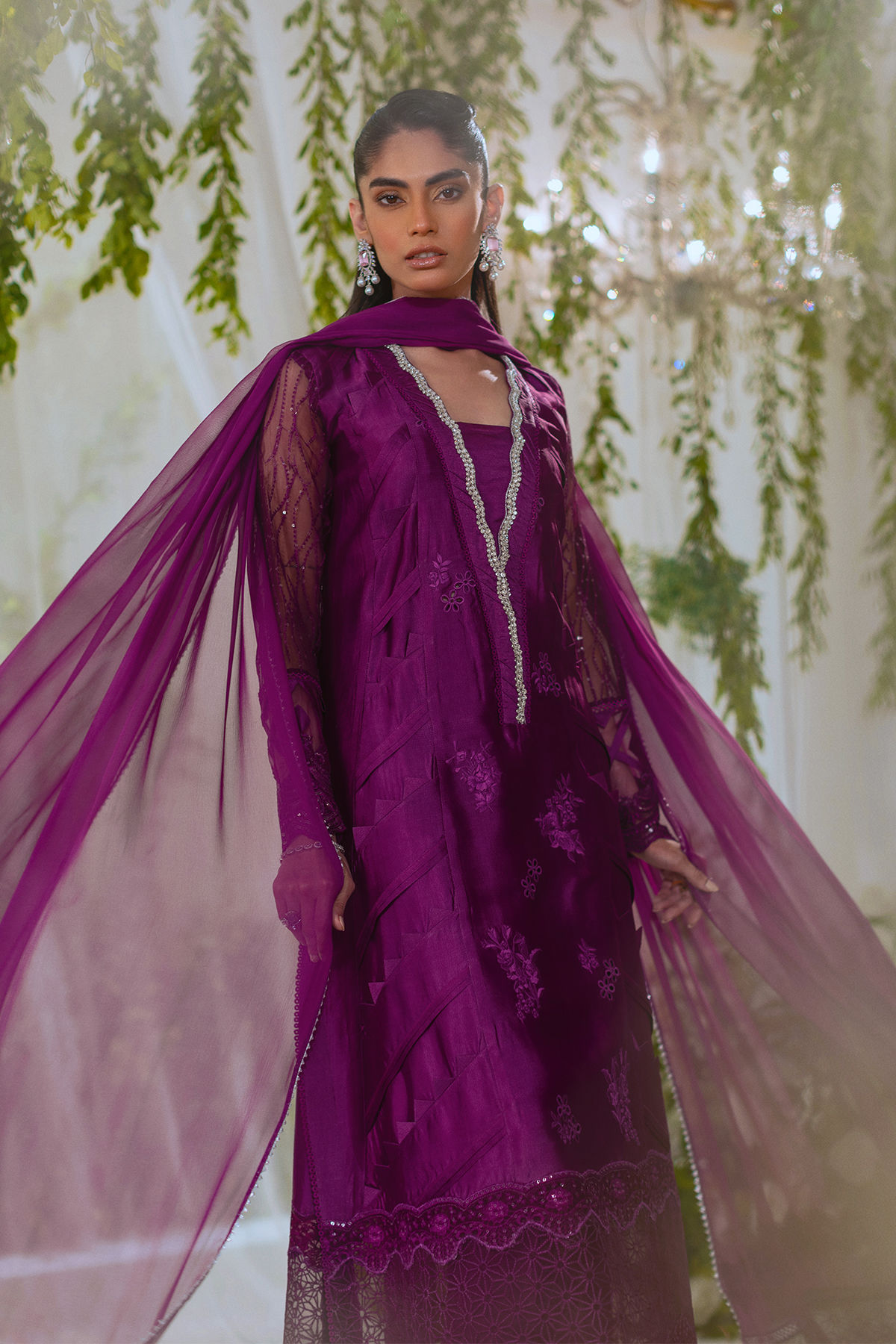 Long silhouette shirt in deepest shade of plum featuring fabric manipulation details on side panels. The neckline is adorned with light catching crystal details. The outfit is paired with signature AA dupatta and matching raw silk pants to turn heads this festive season