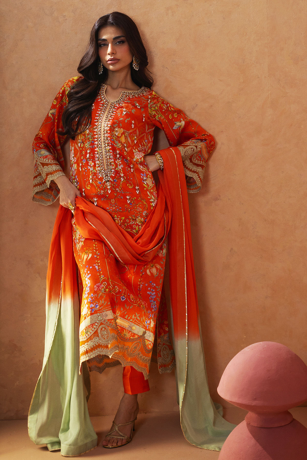 A line shirt in a vibrant tangy orange, showcasing intricate zardozi embellishments at the neckline. The center front is elegantly adorned with dangling tassels, while the hem is meticulously crafted with zari appliqué details. This shirt is complemented by an ombré silk dupatta in mint and orange, and it can be paired with coordinating straight pants to create an exquisite festive ensemble.