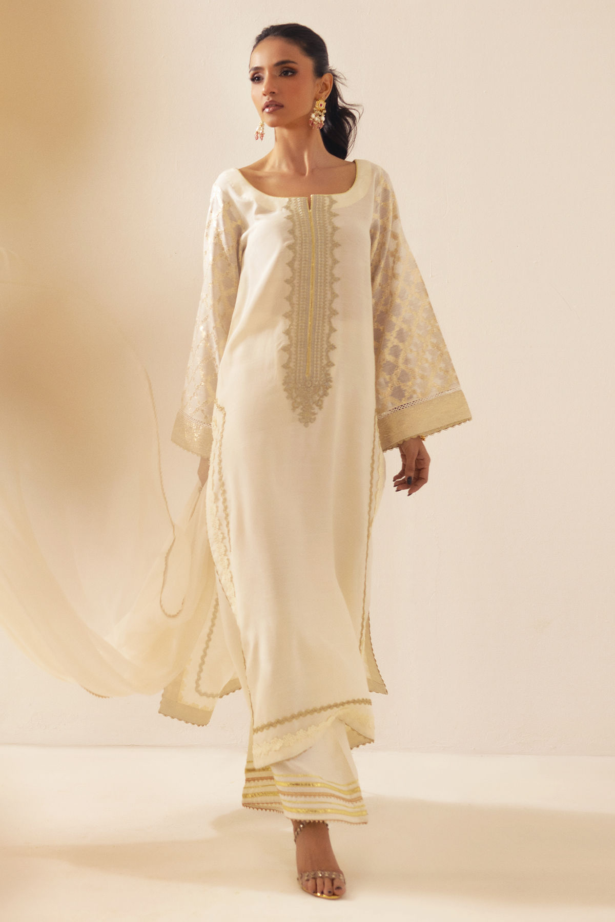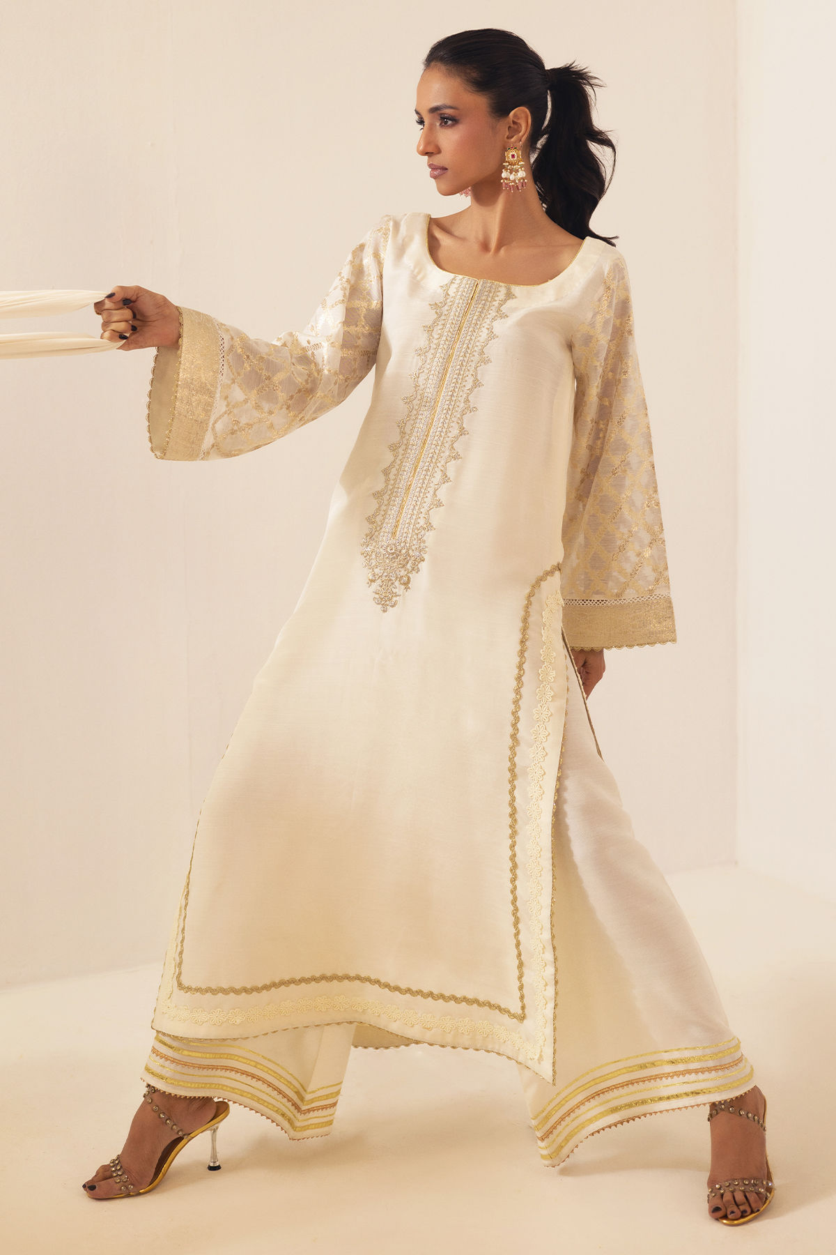 This long silhouette shirt in a delicate ivory is expertly crafted from raw silk canvas, showcasing intricate zari appliqué details along the neckline. The side slits are elegantly enhanced with gota and crochet lace embellishments. The sleeves are meticulously designed with shimmering lorex, and the ensemble is accompanied by matching straight pants and a chiffon dupatta, which is elegantly finished with gota edging, ensuring you stand out this festive season.