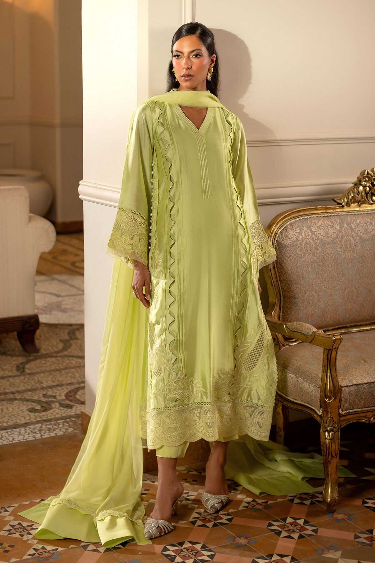Zarrin - Long silhouette shirt in zesty lime silk canvas featuring fabric manipulation details on centre front. The hemline is enhanced with intricate appliqué details. The outfit comes with matching raw silk pants and a chiffon dupatta to set you apart this festive season.