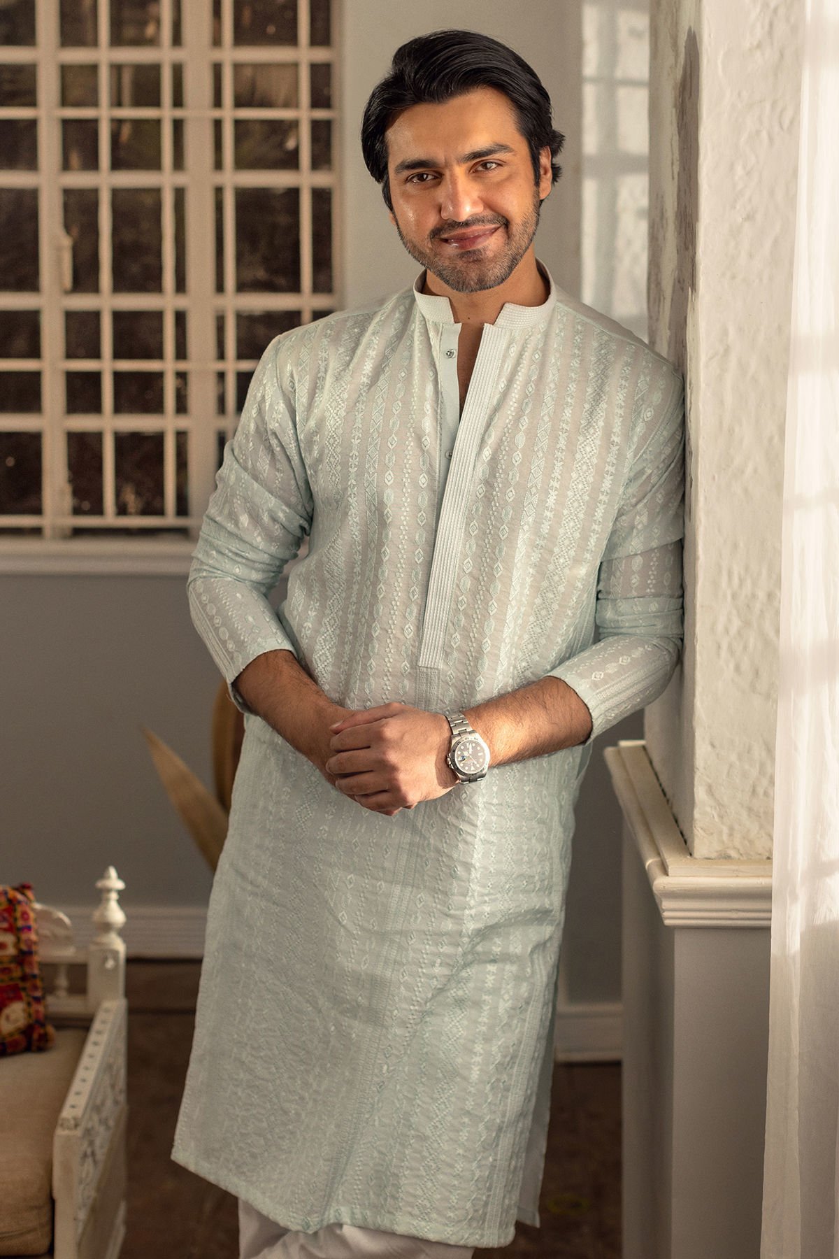 This self-embroidered kurta in an enchanting powder blue showcases intricate tone-on-tone embroidery . The neckline is elegantly adorned with a placket that features refined running stitch details. The collar is further enhanced with decorative anchor running stitch elements. This kurta is designed to be worn with straight cotton pants, providing a refined and cohesive look.
